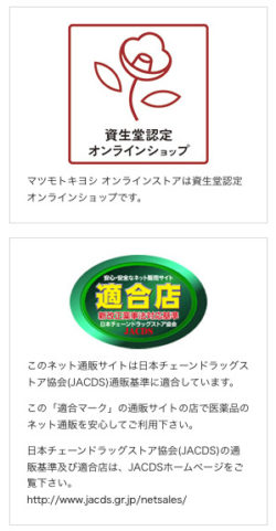 マツモトキヨシのオンラインショップは、資生堂認定、日本チェーンストアドラッグ協会(JACDS)の適合マークももっています。薬品や化粧品などデリケートな商品が多い中、こうしたお墨付きは、通販では大きな安心ポイントとなります。