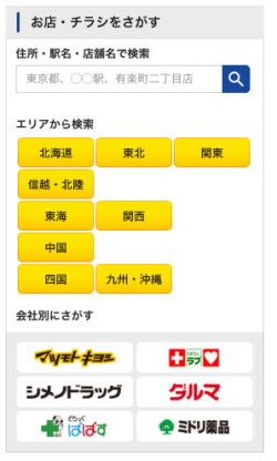 マツモトキヨシのチラシですが、これは地域や店舗、あるいは会社などによって異なります。公式サイトのトップページでは「お店・チラシをさがす」というメニューがあり、そこでは「住所・駅名・店舗名で検索」「エリアから検索」「会社別にさがす」という探し方でお目当てのチラシにリーチすることができます。