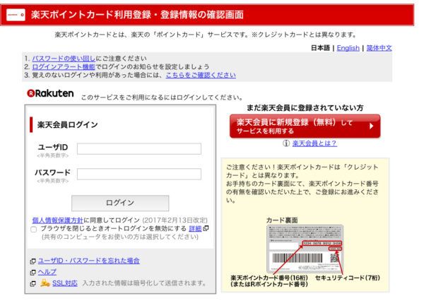 そして、それを入手したら、そのカードの「カード利用登録」を行う必要があります。つまり、これは、既存の楽天会員とのヒモ付けですが、もしまだ会員でない場合はここで楽天会員に新規登録します。カード登録をしてはじめて使える状態になります。ポイントの登録には会員IDとパスワードが必要で、最初に無料の楽天会員登録をしないことには何も始まりません。