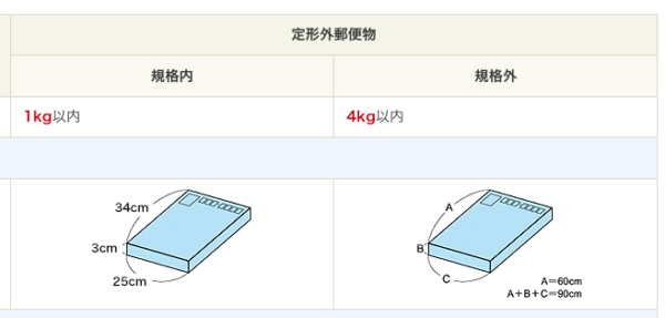 定形外郵便の規格外サイズは、郵便物の縦 x 横 x 厚さの3辺の合計が90cm以内であることが条件となっています。重量は4kgまでOKなので、1kgまでしか送れない規格内と比較して、キャパははるかに上です。